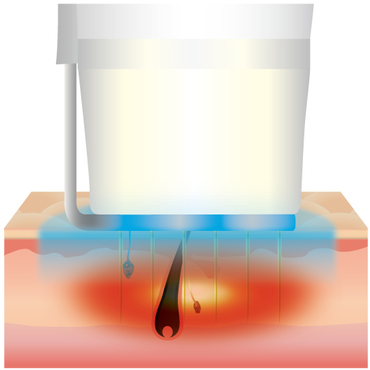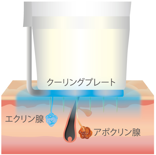 ビューホットは、極細の針から高周波(RF)エネルギーを照射し、ワキの皮膚の下にあるアポクリン汗腺・エクリン汗腺を熱で凝固・破壊します。